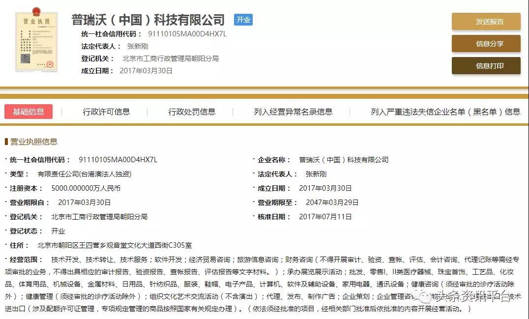 直销头条网编辑在国家企业信用信息公示系统查询到普瑞沃成立于2017年03月30日,注册资金5000万人民币(实缴资金0元)。法人代表张新刚,行政董事兼总经理张新刚,监事张晓龙,自然股东美國普瑞沃實業管理集團(亞洲)有限公司。