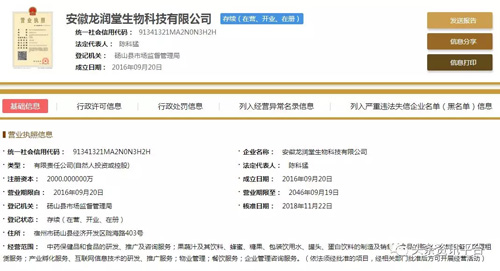 直销头条网编辑在国家企业信用信息公示系统查询到安徽龙润堂成立于2016年09月20日,注册资金2000万人民币(实缴资金2000万元)。法人代表陈科猛,行政董事兼总经理陈科猛,监事张佳庆,自然股东有张佳庆、陈科猛。