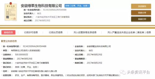 直销头条网编辑在国家企业信用信息公示系统查询到安徽绿氧生物成立于2017年08月29日,注册资金500万人民币(实缴资金150万元)。法人代表徐杰,行政董事兼总经理徐杰,监事徐耀生,自然股东有徐杰、徐耀生。