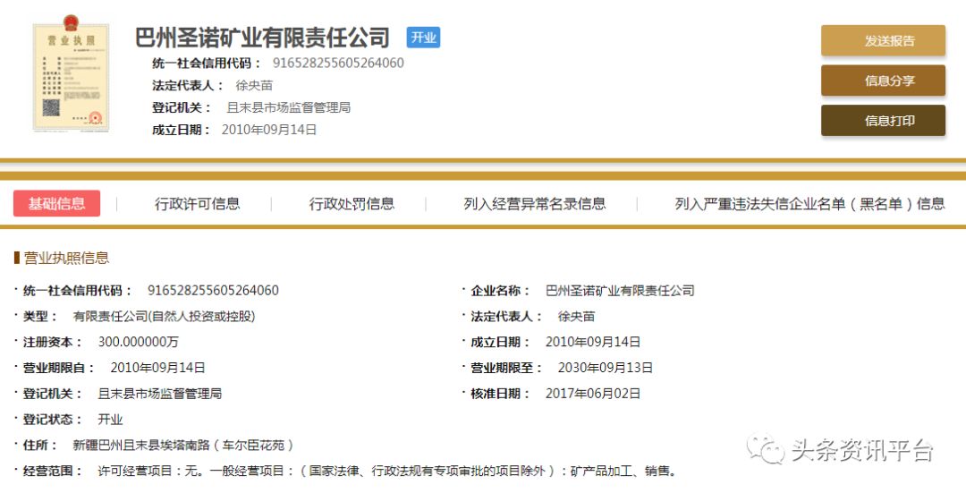 直销头条网编辑在国家企业信用信息公示系统查询到巴州圣诺矿业成立于2010年09月14日,注册资金300万人民币(实缴资金300万元)。法人代表徐央苗,执行董事兼总经理徐央苗,监事黄哲锋,自然股东有谢常均、陈坚锋、徐央苗、孙伟锋、卢小明。