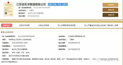 直销头条网编辑在国家企业信用信息公示系统查询到江苏苏洋酿酒成立于1992年06月03日,注册资金2450万人民币(实缴资金450万元)。法人代表王嘉宇,董事长王嘉宇,行政董事兼经理刘芹,监事范济凯,董事王林云,自然股东有王林云、王嘉宇。