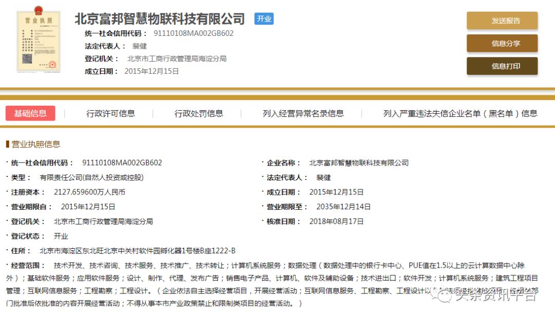 直销头条网编辑在国家企业信用信息公示系统查询到北京富邦科技成立于2015年12月15日,注册资金2127.6596万人民币(实缴资金2127.66万元)。法人代表裴健,行政董事兼经理裴健,监事何庆秀,自然人股东裴健,法人股东有北京中睿博远投资中心(有限合伙)、上海炯烨投资管理中心(有限合伙)、宁波天星广德投资中心(有限合伙),企业法人北京中诚睿邦投资中心(有限合伙)。