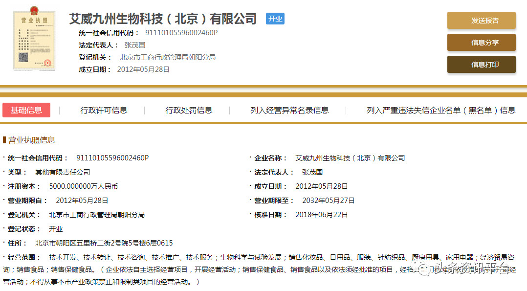 头条资讯平台在国家企业信用信息公示系统查询到北京艾威九州成立于2012年05月28日,注册资金5000万人民币(实缴资金0元)。法人代表张茂国,行政董事兼经理张茂国,监事王健,董事王林云,自然股东有张茂国、中联盛投(北京)控股集团有限公司。