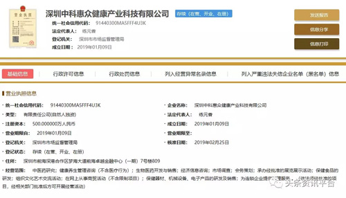 头条资讯平台在国家企业信用信息公示系统查询到深圳中科惠众成立于2019年01月09日,注册资金500万人民币(实缴资金0元)。法人代表练元香,行政董事兼总经理练元香,监事周依姣,自然人股东练元香。