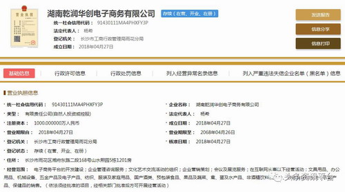 头条资讯平台在国家企业信用信息公示系统查询到湖南乾润华创电子成立于2018年4月27日,注册资金1000万人民币(实缴资金0元)。法人代表杨希,行政董事兼经理杨希,监事杨桃辉,自然股东有傅德朝、杨桃辉。