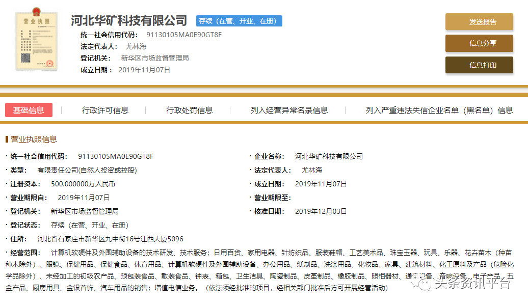 头条资讯平台在国家企业信用信息公示系统查询到河北华矿科技成立于2019年11月07日,注册资金500万人民币(实缴资金0元)。法人代表尤林海,执行董事兼经理尤林海,监事付淼,自然人股东有季灵、尤林海。