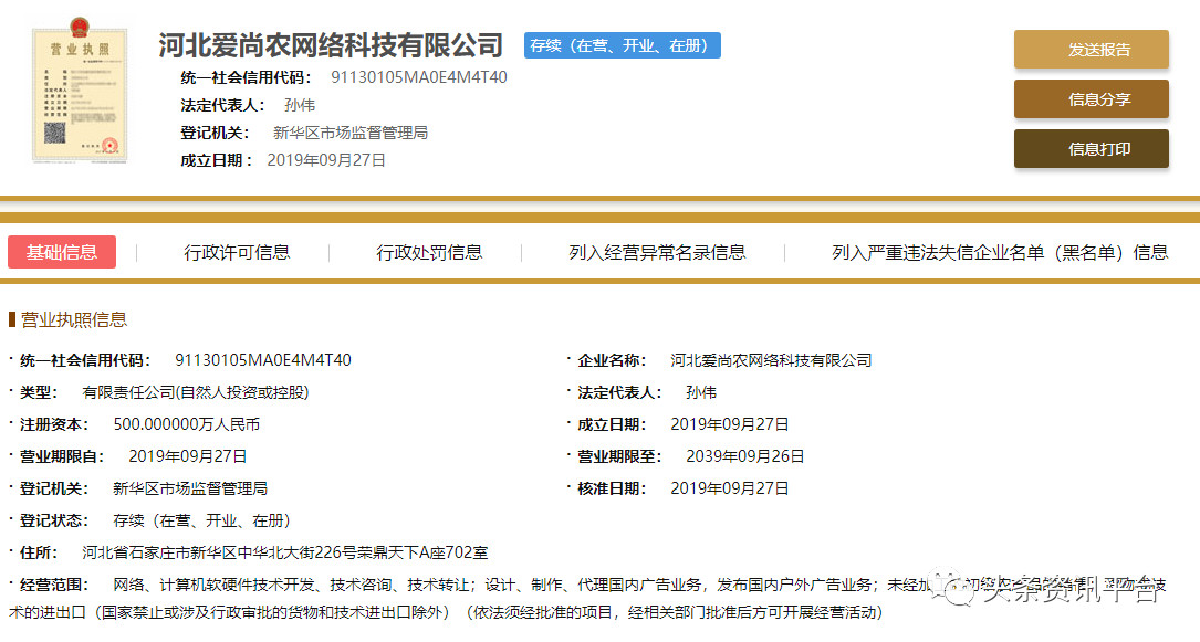 头条资讯平台在国家企业信用信息公示系统查询到河北爱尚农成立于2019年09月27日,注册资金500万人民币(实缴资金0元)。法人代表孙伟,执行董事兼经理孙伟,监事孙贝贝,自然人股东有孙贝贝、孙伟、王威豪、侯继广。