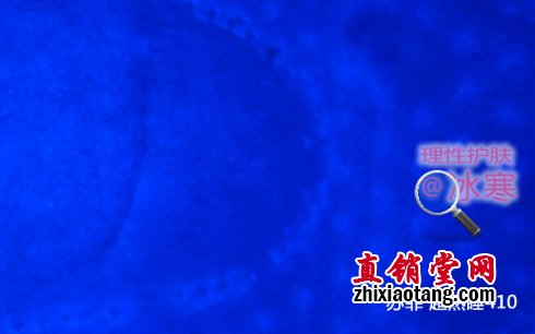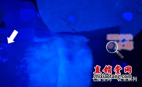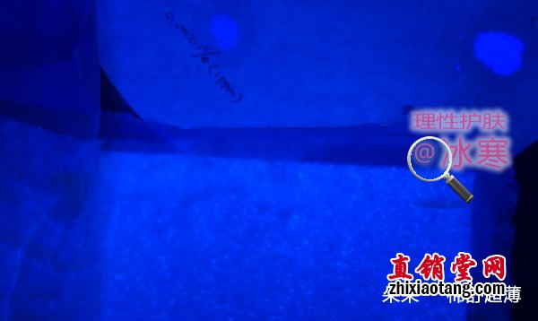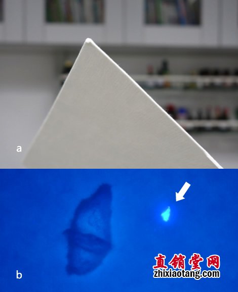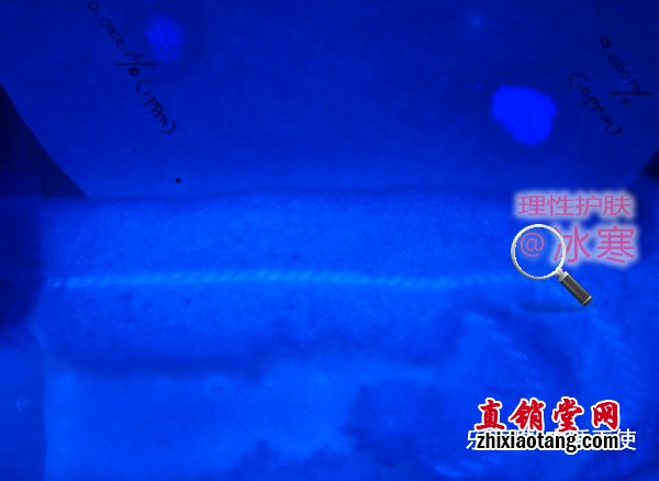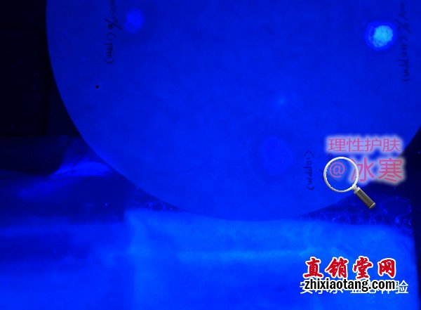 将此细绒与卫生巾吸水棉芯中的纸浆一起放在无荧光的滤纸上以伍德灯照射,可见:因光学效应,含有荧光剂的细绒只要极少的量就能发出强烈蓝白色荧光,周围有光晕;而无荧光的纸浆中央偏白,四周有一暗带。如下图:
