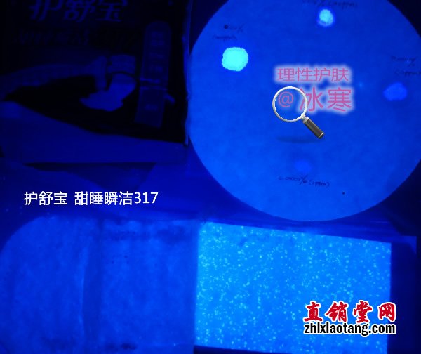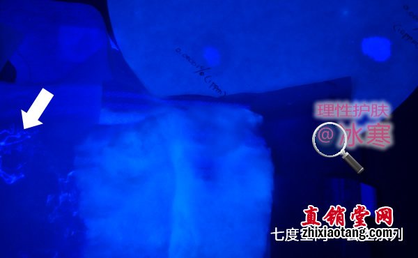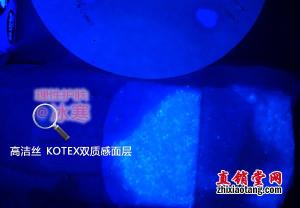 本次测试中亦有发现,用于粘和的胶质、外包装膜上的油墨、用于锁水的高分子吸水树脂(SAP)颗粒均有荧光反应。但这些均不接触皮肤,也不是纸浆中的添加成分,故没有必要介意,如下图: