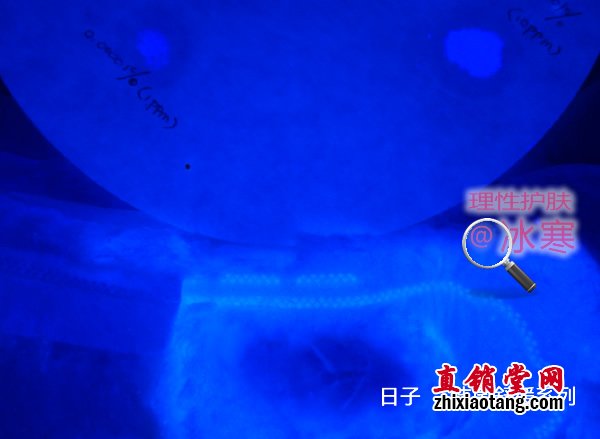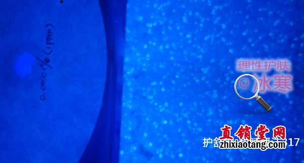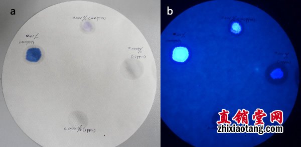 以一种常用的荧光染色剂0.1% Calcofluor White Stain(Sigma-aldrich ),梯度稀释至10倍(100ppm)、100倍(10ppm)、1000倍(1ppm),滴于无荧光的定性滤纸上,以伍德灯照射并拍摄照片,作为比色基准。该基准表明伍德灯可以识别出低至1ppm浓度的这种荧光剂。
