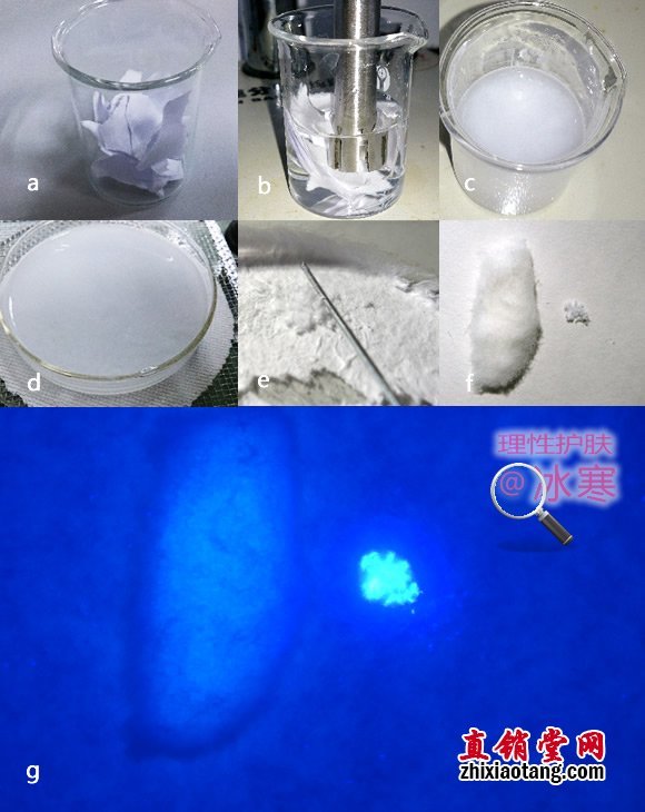 以可发出长波紫外线的伍德灯照射含有荧光增白剂的物质,即可见蓝白色荧光。荧光增白剂含量越高,荧光越强。