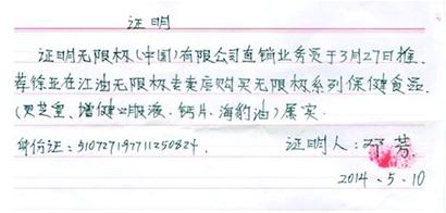 胡先生认为,徐娅的死亡与服用无限极灵芝类产品有着直接的关系。他说,在送进医院前,无限极经销商们还是积极与他商量妥善解决。可是,当徐娅死亡后,最初的经销商及公司层面没有人来过问此事。“他们都打起了太极,有次我们到分公司去,还把警察都惊动了。”胡先生说,他们试图去找当初在江油的无限极店铺时,店铺已关门了。为此,他只好准备请律师,通过法律途径依法维护自己的合法权益。