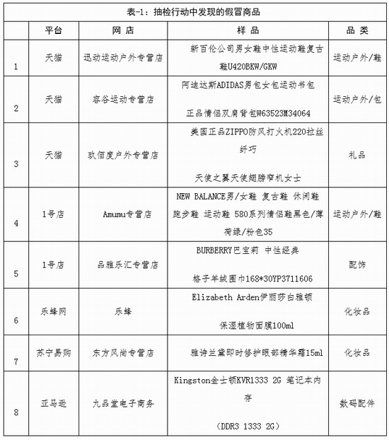 记者从国家工商总局获悉,国家工商总局网监司委托第三方检测机构对天猫、京东商城、1号店电商平台11月11日当天促销的商品进行抽检,发现天猫、苏宁易购、亚马逊、乐蜂网等6个电商平台上的15个批次的样品属于假冒商品或高度疑似假冒商品。