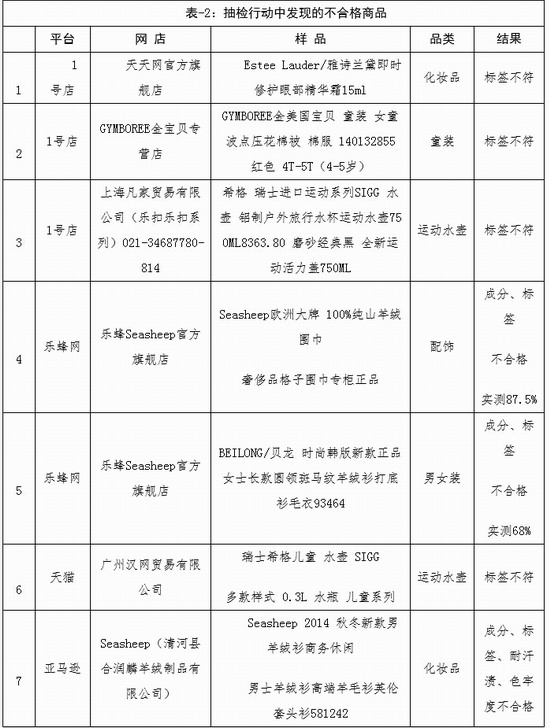 商品质量不合格或标签不符合的7个批次样品,涉及1号店上的“天天网官方旗舰店”、“GYMBOREE金宝贝专营店”、“上海凡家贸易有限公司”;乐蜂网上的“Seasheep官方旗舰店”;天猫上的“广州汉网贸易有限公司”;以及亚马逊上的“Seasheep清河县合润麟羊绒制品有限公司”。另有7个批次的样品涉嫌假冒商品,包括4个批次的礼品、2个批次的化妆品、1个批次的箱包,目前正在进行进一步分析、确证。