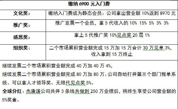 为了明确杰康诺到底是不是传销,记者向该经销商了解了杰康诺的奖金制度。据该经销商介绍,杰康诺采取无产品销售的方式来运作,经销商们要做的就是投资6900元,然后便可参与公司分红,再推广发展下线,便可取得更多分红效益。以下为杰康诺奖金制度:
