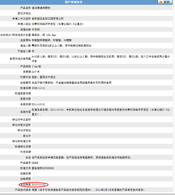 同样,记者在国家食药监总局的官方网站上,发现吉林修正生物工程有限公司生产的修正牌修钙颗粒的批准文号为“国食健字G20080681”,其有效日期截止时间为2013年11月10日。