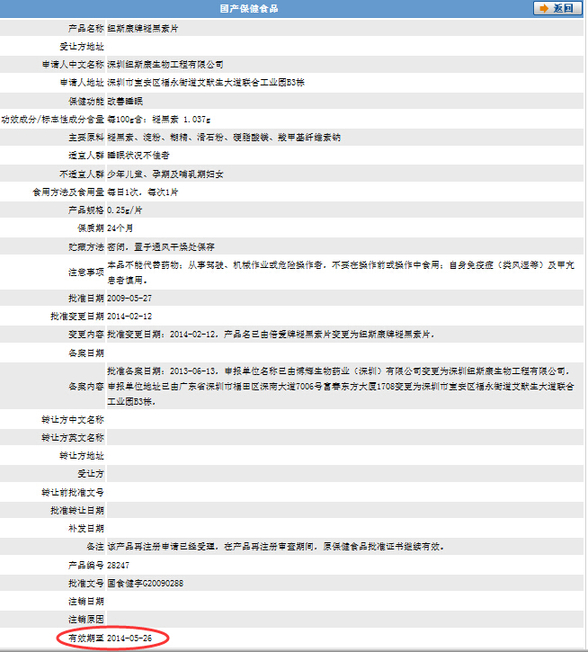 记者在深圳纽斯康生物工程有限公司的官方网站看到,其产品中心一栏中,纽斯康牌褪黑素片在热卖。而记者在国家食品药品监督管理总局的数据库里查询得知,纽斯康牌褪黑素片,国食健字G20090288,有效期至2014年5月26日。纽斯康牌褪黑素片批准文号已经过期,却仍在非法销售。