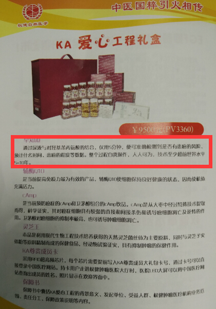 记者在该宣传册上看到,权健一款售价高达9500“KA爱心工程礼盒”系列产品宣称:“通过尿液与对羟基苯丙氨酸的结合,仅用5分钟,便可准确检测是否有患癌风险,预计什么时间、患癌的程度等数据,整个自我操作,人人可为,技术至少超前世界水平5到10年。”