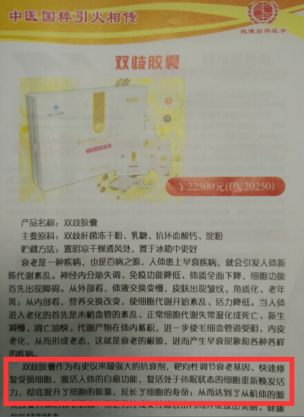 事实上,记者在权健宣传资料上了解到,大部分产品都存在夸大功能、虚假宣传的嫌疑,例如一款售价高达22500元的双歧胶囊宣称是有史以来最强大的抗衰老剂,靶向性调节衰老基因,延长细胞能量。而国家食品药品监督总局数据查询中心显示,其批准功效仅仅是改善胃肠道功能(调节肠道菌群)、免疫调节。