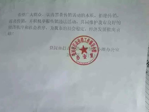 最近湖南“华莱健”利用安化黑茶在河南省登封大搞传销活动。以2万元买4盒黑茶即可入会,宣称发展几个下线,成为某某级别的盘主,就能赚到10万元,再继续发展可以晋级为另外一个级别,可以赚到更多的钱。现在登封发展迅速,已经陆续开了十几家以安华黑茶为幌子的所谓“茶楼”,利用茶楼搞“成功分享”等洗脑活动。大有愈演愈烈,一发不可收拾之势。近日,登封市工商局根据河南省工商局将查处登封黑茶传销活动列为重点督办案件,登封工商局成立打击传销活动领导小组,并抽调执法人员组成专案组。通过调查取证,掌握了黑茶传销情况,认定了其在登封从事传销活动的事实。随后登封工商局发布官方文件,“华莱"黑茶已被登封工商局认定传销。