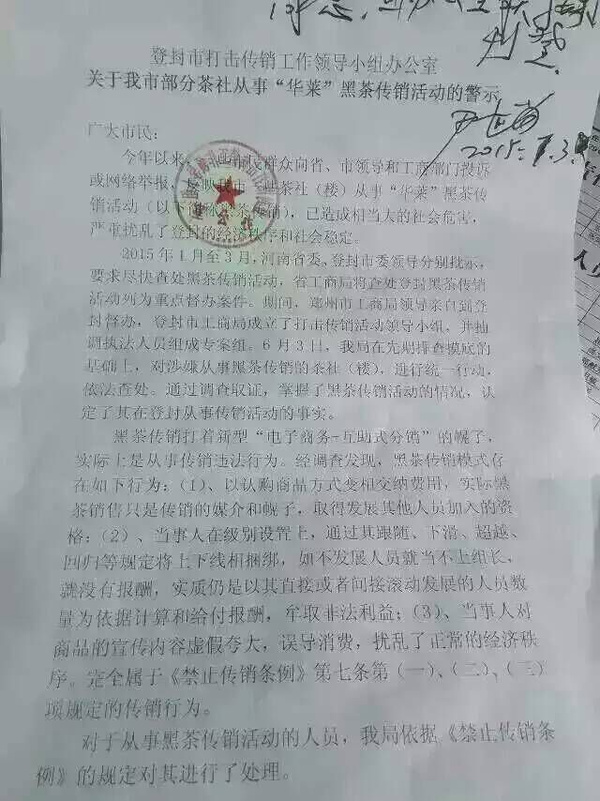 “华莱”黑茶涉嫌传销,已被登封市工商局调查