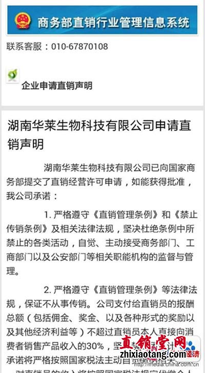 案发同时,本网通过商务部直销行业管理信息系统查询,华莱生物科技有限公司目前正向国家商务部申请直销牌照。 2015年10月9日,该公司在商务部直销行业管理信息系统发表《湖南华莱生物科技有限公司申请直销声明》,称公司要“严格遵守《直销管理条例》等法律法规,保证不从事传销,坚决禁止团队计酬,绝不以缴纳费用或者购买商品作为直销员加入公司的条件。同时要严格履行信息披露义务,及时准确地向商务部、工商总局报备相关内容,向社会公众披露有关信息。”