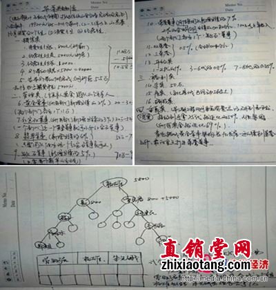 现场查获收缴的会议记录本摘录的奖金制度和金字塔发展模式