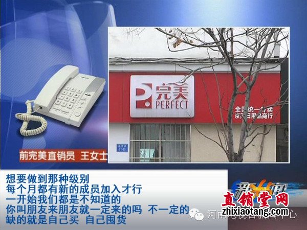 完美公司不“完美” 制度显猫腻 听完小冉的遭遇,怎么想都觉得像是传销呢?为了证实小冉的说法,记者借口想加入完美产品销售,记者来到了带小冉入行的张总的专卖店,见到了所谓的张总。