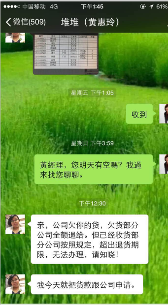 1月15号,分公司经理黄惠玲和我微信联系,很亲切的说会帮我,并约定时间见面聊。16号,我去广州分公司和黄经理见面。把我的经历和黄经理讲了。讲到因负债而生活拮据时,我忍不住泪流满面。黄经理安慰我说没事,答应帮处理相关退货退单的事宜,并复印资料教我如何一步一步按流程走,说上海出差3天,回来后便可以把货拿到公司盘点,从公司出来,我兴奋地和伙伴分享了这来之不易的喜悦,终于可以还债了,终于可以不被家人责骂了。终于可以不再为堆的像仓库一样多的产品烦恼了。但是,当晚就接到其中一个上线老师的电话,说好久不见想我了,约我18号见面。我答应了,第二天又接到苏老师的电话,她告诉我说:“黄经理跟她说我拉着一车货到公司退货,黄经理把这件事交给她处理。因为公司不管团队的事情,叫我不要犯傻,肯定的告诉我公司不可能给我退货退单。还说她能拿出一系列的证据给克缇张总,证明我去过某家日用品公司,还义正言辞的威胁我说,如果我要退她一定会站出来……”挂完电话,太多的问题令我疑惑不解。