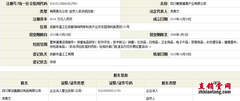 衡爱健康成立于2015年10月29日,注册资金为8018万元人民币,法定代表人是凌贵文。主营范围包括:营养健康咨询服务;保健食品研发;研发销售化妆品、日用品、卫生用品、电子产品、家居用品、健康器材等。股东大家可以明显看到是四川莱创嘉蔓日用品有限公司和凌贵文。那么这个公司法人股是什么来头?