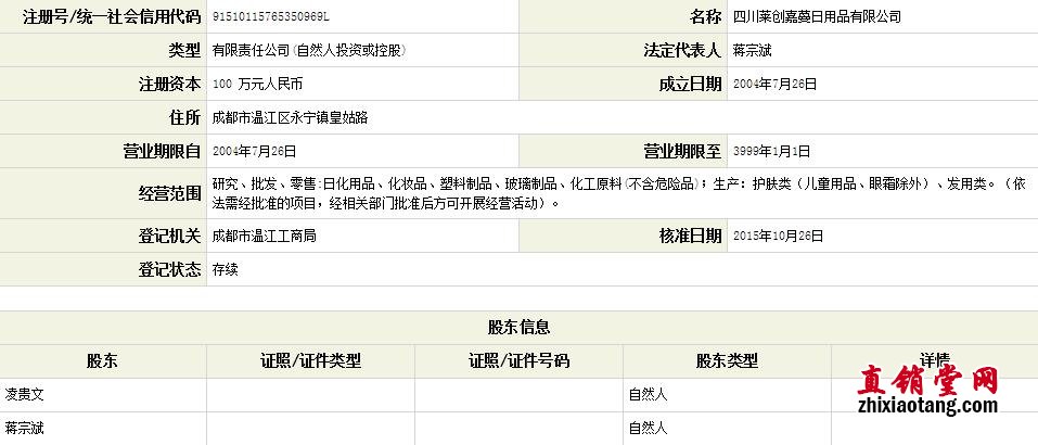 四川莱创嘉蔓日用品有限公司成立于2004年7月26日法人是蒋宗斌,股东是凌贵文和蒋宗斌。再往下看就露出端倪: