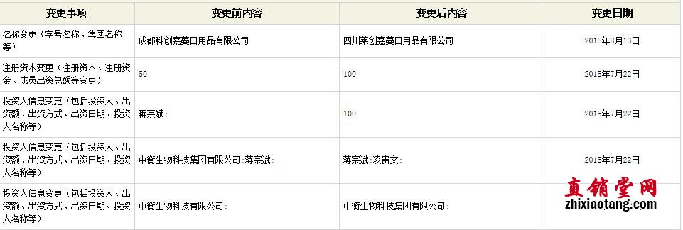 原来四川莱创嘉蔓日用品有限公司股东就是中衡生物科技有限公司,在2015年7月22号变更成个人股东蒋宗斌。2015年8月13号成都科创嘉蔓日用品有限公司变更成四川莱创嘉蔓日用品有限公司 。难道是中衡生物不想继续挂靠海南荟生,不过这家公司老总还是非常喜爱双方合作注册的公司名称衡爱。