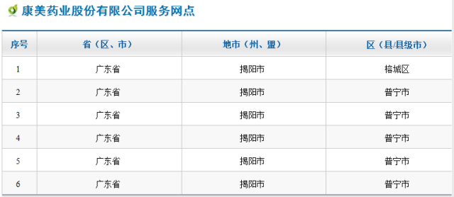 商务部直销行业管理信息显示,康美药业的省级分支机构只有广东省,6个服务网点都在广东省的揭阳市。这也就意味着康美的直销经营活动只限于广东省境内。