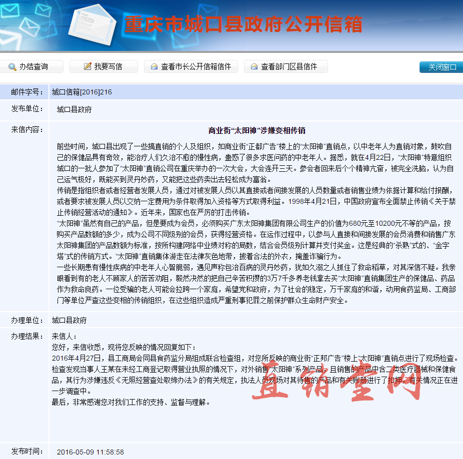 近日,直销堂网从重庆市城口县政府官方网站获悉,有消费者投诉“太阳神”涉嫌变相传销,当地工商局以及食药监分局经过调查,进行了查处。