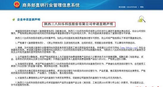 今年4月底,据行业人士爆料称,陕西三八妇乐科技股份有限公司(以下简称三八妇乐)已经获得了商务部颁发的直销牌照,成为陕西省获牌的第一家直销企业。对此,第一直销网在查阅商务部直销行业管理信息系统后发现,该企业获牌信息截止目前并未得到公示。