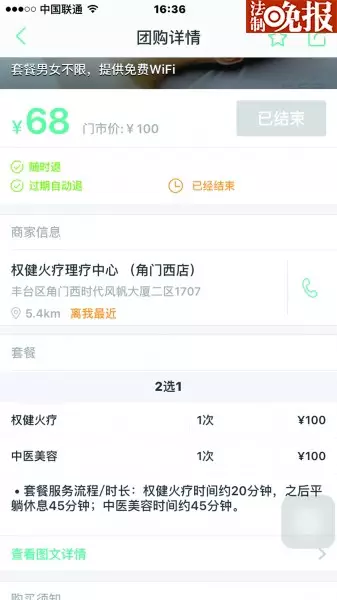 记者发现页面中部有“往期团购(2)”的字样,点开后显示该店在美团上有两个已结束的团购活动。其中一个套餐团购价为68元,注明“套餐男女不限,提供免费WIFI”,其门市价为100元。继续点开此套餐的链接,发现该套餐包括“权健火疗”和“中医美容”两个内容,消费可二选一,其中注明,火疗时长为20分钟。