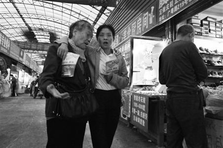 广粤路副食品市场内华怡健康生活馆前,工作人员“邀请”老人听课。
