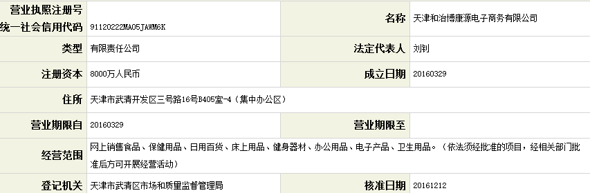 头条君(微信:ds-toutiao)在全国企业信用信息公示系统查询到天津和治博康源电子公司成立于2016年3月29号,注册资金8000万人民币,法人是刘钊,股东是刘宝育、蔡文昊、韩涛、曹翰文、刘长禄。目前总经理是吕培刚,曾服务过天狮、中威等直销公司。