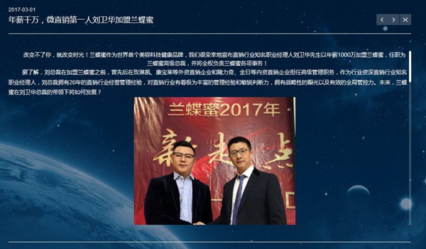 3月1日,兰蝶蜜在其网站官方宣布了刘卫华的加盟。据兰蝶蜜相关负责人透露,兰蝶蜜在2017年将全渠道进行布局,并以微商与直销两者之间的独特性构筑的“微直销行业生态链”,提高市场信息流通度,因此公司方面希望刘卫华能利用20多年的直销管理经验,实现微商与直销的无缝链接。