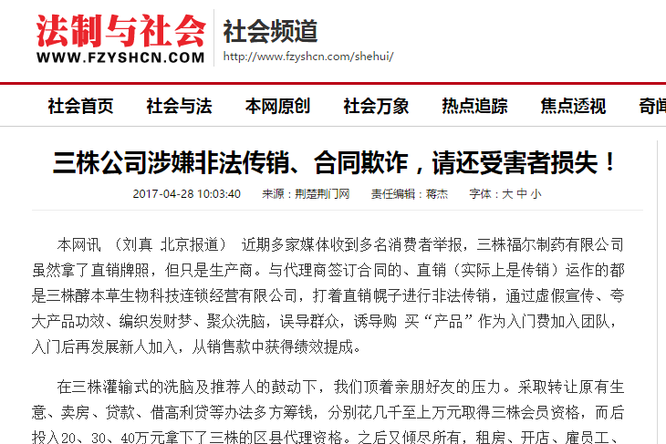 近期多家媒体收到多名消费者举报,三株福尔制药有限公司虽然拿了直销牌照,但只是生产商。与代理商签订合同的、直销(实际上是传销)运作的都是三株酵本草生物科技连锁经营有限公司,打着直销幌子进行非法传销,通过虚假宣传、夸大产品功效、编织发财梦、聚众洗脑,误导群众,诱导购 买“产品”作为入门费加入团队,入门后再发展新人加入,从销售款中获得绩效提成。