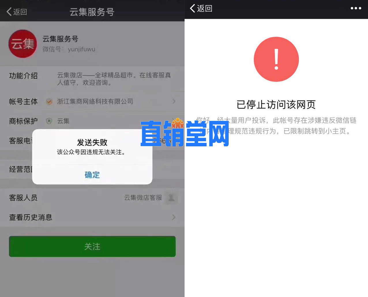 直销堂网讯:据网友爆料,8月10日,曾刷出“1天卖出150万片牛排”、“2小时卖出30万只新奇士夏橙”销售奇迹的云集微店官方订阅号和服务号被腾讯封号了。