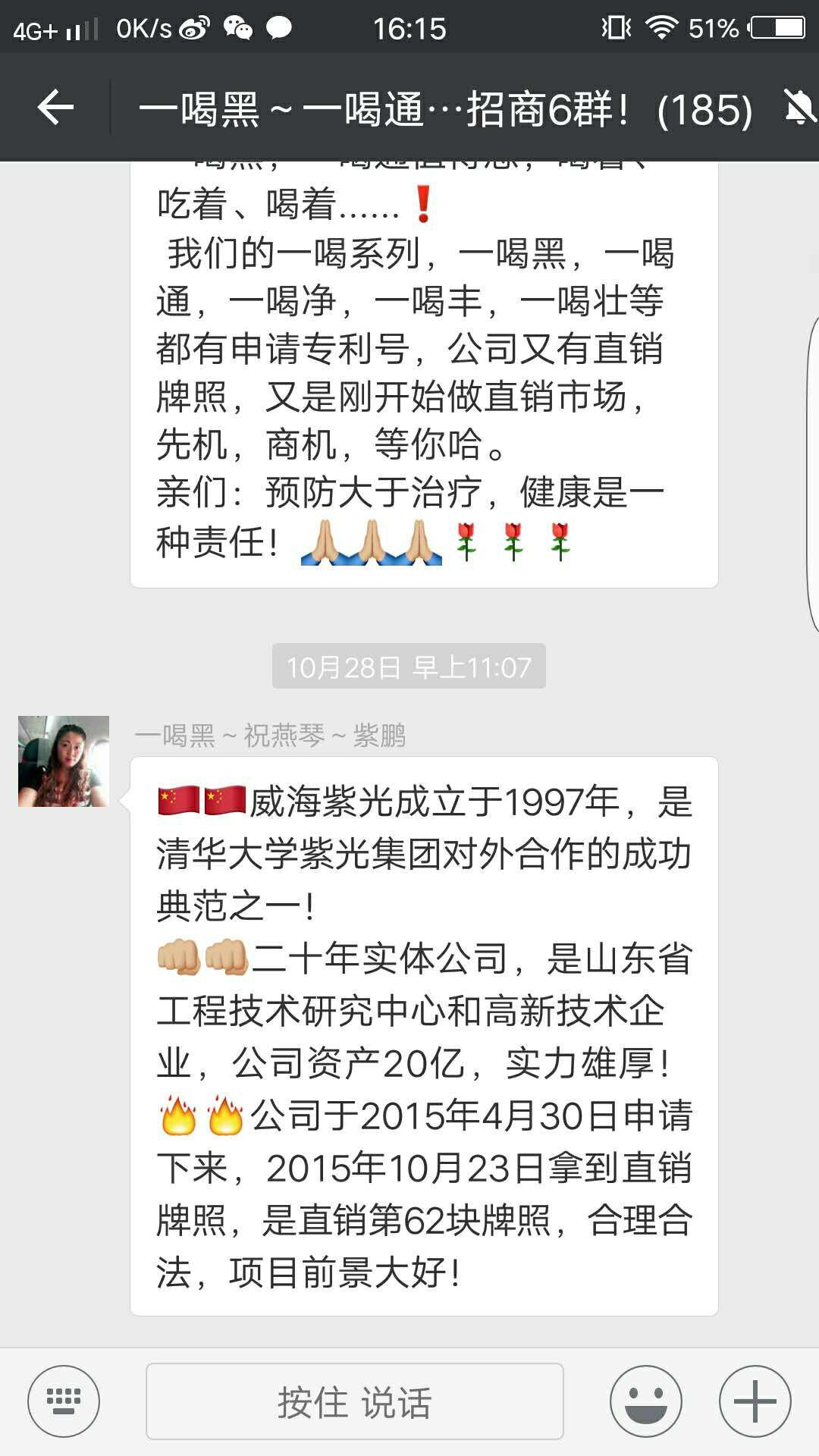 目前有网友提供消息,“一喝黑”也挂靠威海紫光,本网得到该直销人在群内的宣传截图,具体如下: