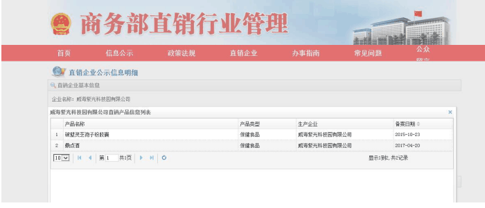 但实际上,威海紫光在国家商务部备案的又有那些呢?小编从国家商务部直销行业管理中查到,威海紫光只有两款产品在商务部备案,即:破壁灵芝孢子粉胶囊与鼎点酒。那么,如此多的威海紫光产品究竟是怎么进入直销产品序列的呢?