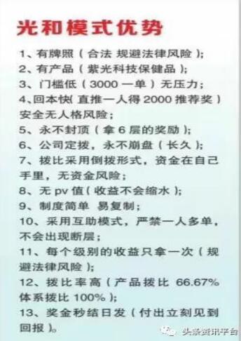 该公司自创又大力推崇的“光合模式”,听起来又是什么“共享健康”、什么“共享经济财务”。小编通过大量的信息搜集,发现家和众信的一个经销商通过微信大肆宣传光合模式。其中提到“拨比率高达66.67%”,“投入三千短短几个月赚几十万甚至百万”,如此极具煽动性的语言让人不得不心生疑虑。 而所谓的光合模式就是通过下线分成的模式进行业务推销,而且是多层次奖金制度,这已经涉嫌传销。