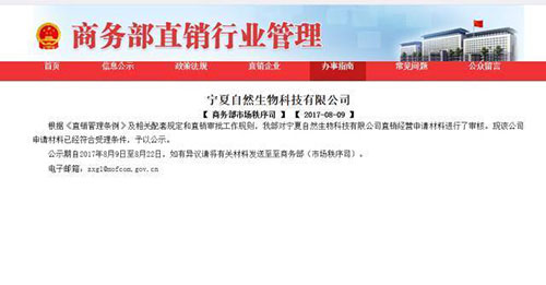 根据《直销管理条例》及相关配套规定和直销审批工作规则,我部对宁夏自然生物科技有限公司直销经营申请材料进行了审核。现该公司申请材料已经符合受理条件,予以公示。
