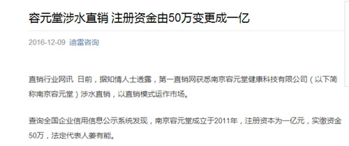 日前,据知情人士透露,南京容元堂健康科技有限公司以直销模式运作市场,有意涉水直销。据查询,南京容元堂成立于2011年,注册资本为1亿元,法定代表人姜有能,满足直销申牌的条件之一。