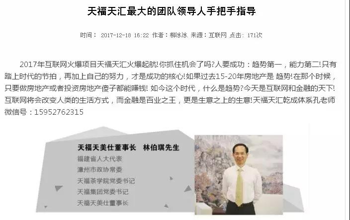 记者从微信上联系到了一位自称天福天汇某招商中心的经销商。面对记者“看起来像资金盘,能否保证返利”的疑问,该经销商回复称:“现在的传统企业,直销企业都在走互联网商业模式,返利能不能保证,看公司有没有实力。直销企业和传统企业最大的差别是,要注册一家直销公司,保证金实缴就要8000万,而传统企业注册都没什么要求,这样对比,直销企业更有实力。”该经销商进一步介绍:“天福天汇是天福集团的金融板块,12月31日启动。天福集团下属--天福天美仕,天福天汇。天福集团总裁李世伟,天美仕和天福天汇的董事长法人均为林伯琪。林伯琪同时是天福集团党委书记。”