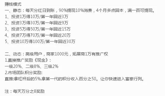 另一位经销商给记者解释其模式:“投1万,送10万积分,每天按10万的万分之八返,就是每天 80元,总的算下来,四个多月回本了。”而这仅仅是静态返利。在他看来比较慢,要是想赚快钱,还是要做动态,也就是推荐消费者和商家加入。