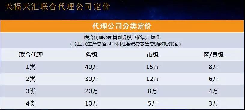 为了向经销商更具体的描绘美好前景,该方案举例说明199个省级代理商每个人所能达到的收益:浙江省2016年GDP为4.6万亿,消费占比为45%,约2万亿。假设浙江省年消费品零售总额的5%来自天福天汇: ¥ 2万亿×5%≈1000亿×6‰≈6亿/199人=约300万(积分奖励)。以此计算,¥ 年实际所得:¥300万×0.08% ≈2400(天宝)/天×30天≈7.2万×12个月≈86万/份/年。也就是说,一个省级代理一年就可以拿到86万。而一个省级代理,最多一年也就是投入40万。