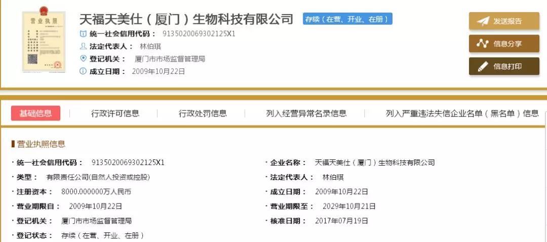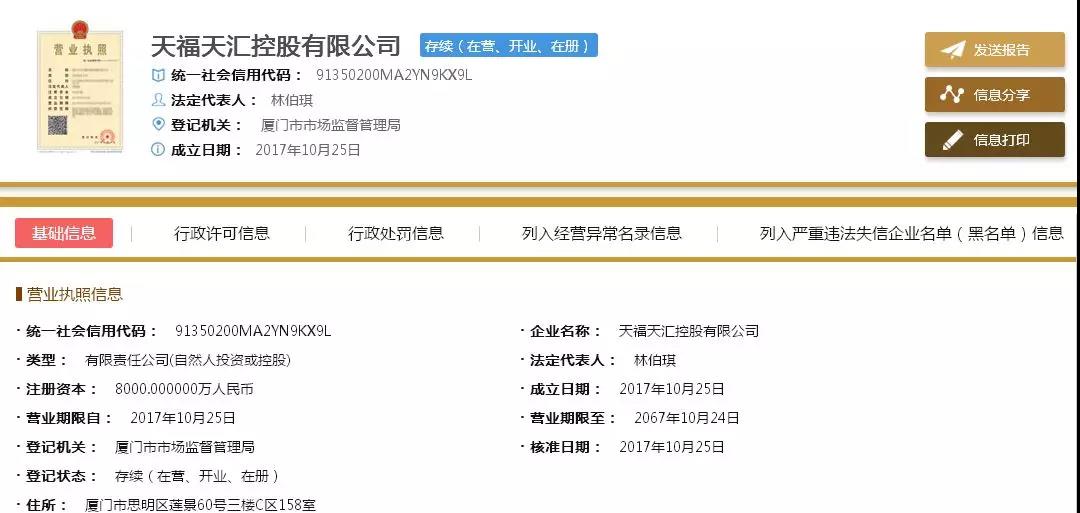 记者从国家企业信用信息系统查询天福天汇公司的相关信息发现,该公司成立于今年的10月25日,法定代表人是林伯琪。